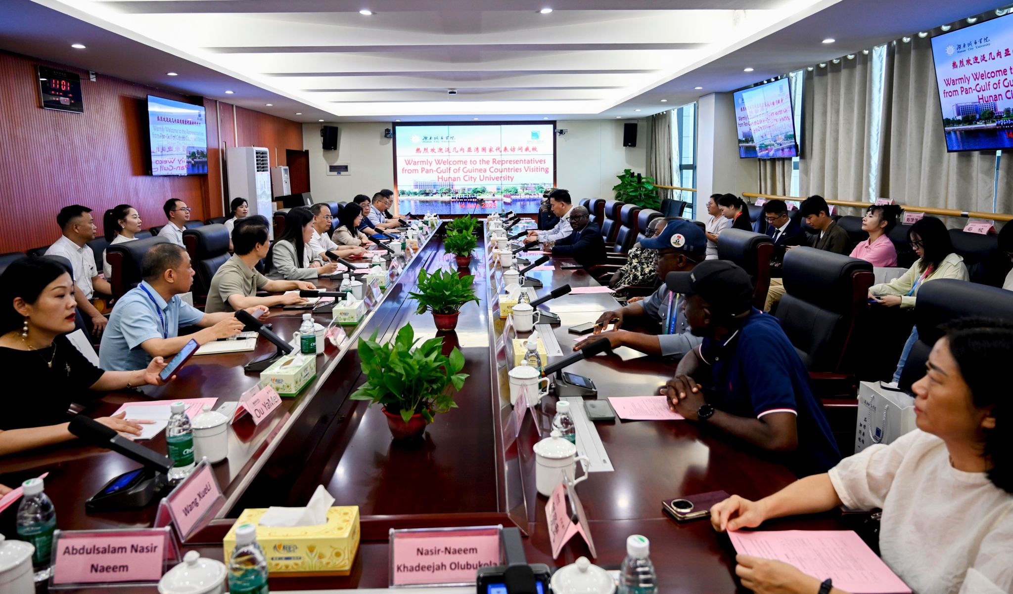 本网讯 6月14日,来自加纳、尼日利亚、塞拉利昂等泛几内亚湾国家代表来校访问考察,共植友谊之树,共谋合作发展,深化双方在教育、科研、经贸领域的交流合作。校长何振、副校长徐姝出席交流座谈会。