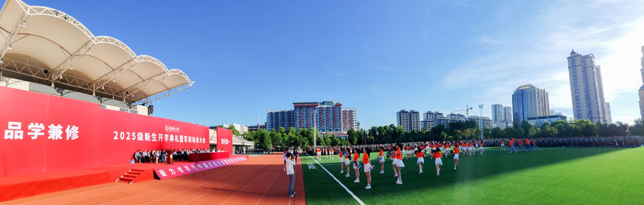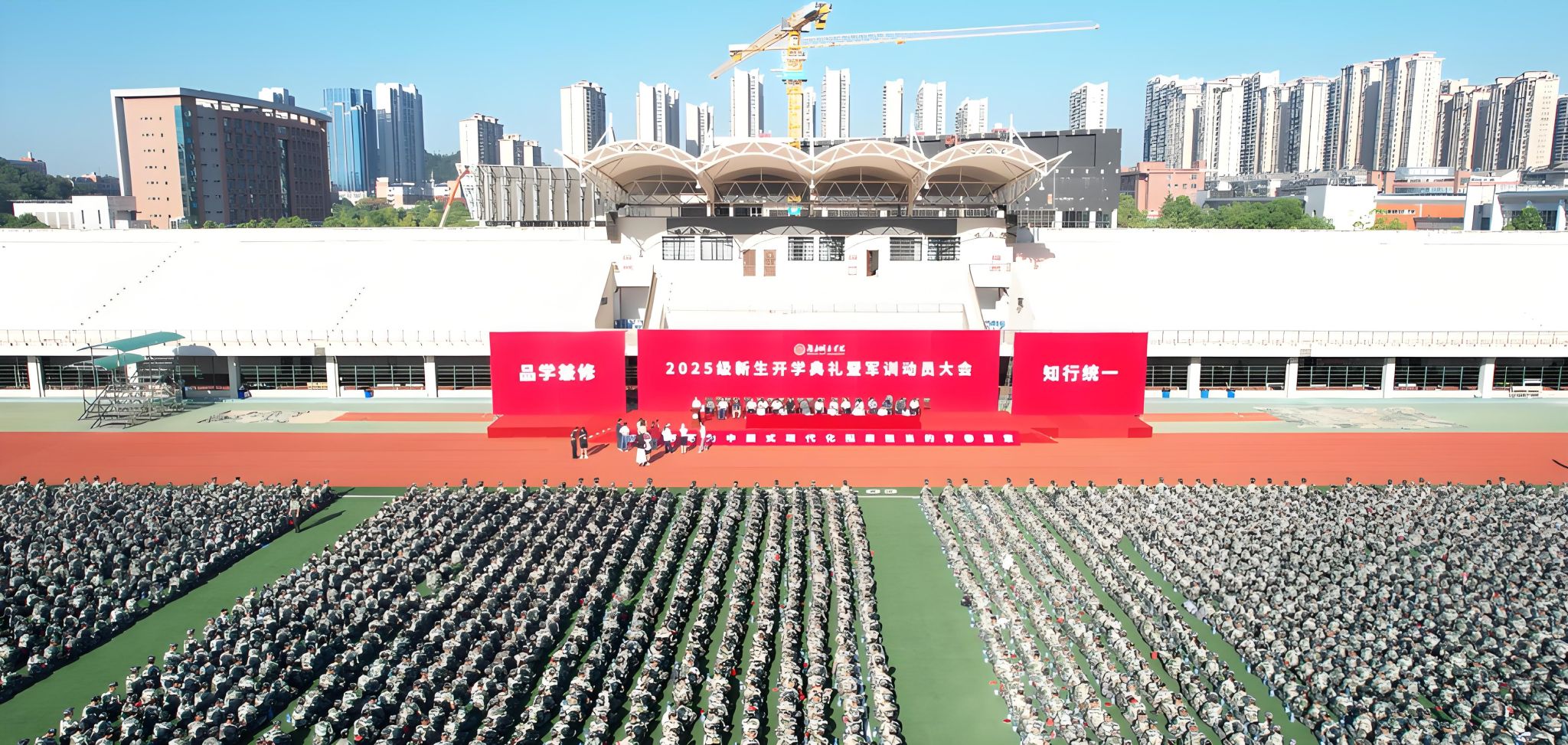 本网讯 苦尽甘来,十年寒窗终圆梦。乘风破浪,万里晴空任尔飞。9月17日上午,yl23455永利官网2025级新生开学典礼暨军训动员大会在学校东田径场举行,6900余名2025级本科生、研究生新生承载着殷切期望、怀揣着青春梦想,在城院开启人生新征程。校党委书记何振寄语2025级新生:要以“城”之名,砥砺报国,共织城市摇篮之美,充分认识、尊重、顺应城市发展规律,探索智慧城市建设新领域,在未来城市的画卷上留下青春注脚。