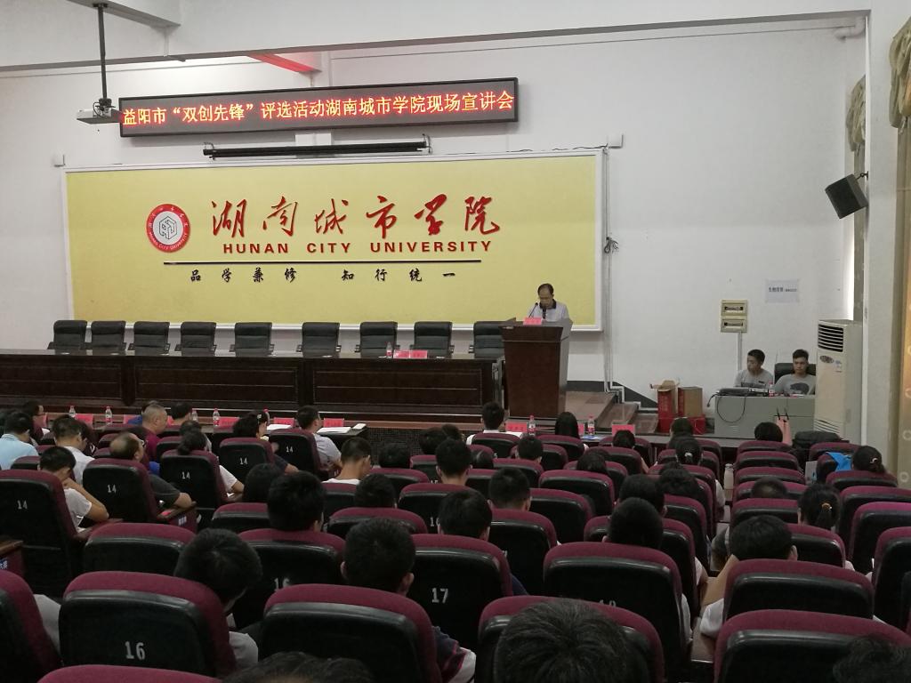 (本网讯)9月6号下午,益阳市“双创先锋”评选活动现场宣讲会在永利官网电信楼视频会议室举行。益阳市政府常务副秘书长杨光辉,副秘书长、金融办主任欧春芳,团市委书记孔令强,市政府办银行保险科科长宋灿,市委组织部、市新闻中心、市科技局、市人社局、市商务局、市教育局、高新区、龙岭工业园、长春经开区负责人以及学校副校长何振和相关职能部门、二级学院负责人、部分师生代表参加了宣讲会。会议由孔令强主持。