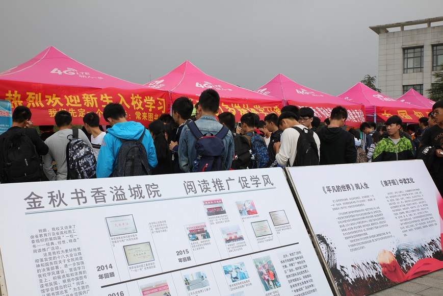 (本网讯)为响应省教育厅及省高校图工委关于在高校举办第四届“一校一书——经典、经世、精读”阅读推广活动的号召,进一步加强永利官网学风建设,营造学习至上、积极进取和浓厚的读书氛围,图书馆与教务处、学生处、校团委、宣传部、党政办于近日联合组织开展了“金秋书香溢城院”主题活动,在全校师生范围内广泛开展阅读推广。