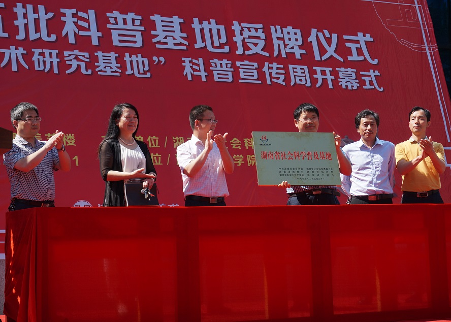 党委书记罗成翼为活动致辞,湖南省社科联副巡视员丁宇宣读《关于认定第五批湖南省社会科学普及基地的决定》并为基地授牌,。