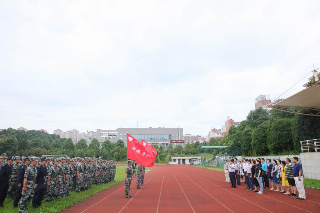 仪式上,罗成翼和雷存喜代表学校分别向军训教导队、民兵预备役分队和学生纠察队进行了授旗。