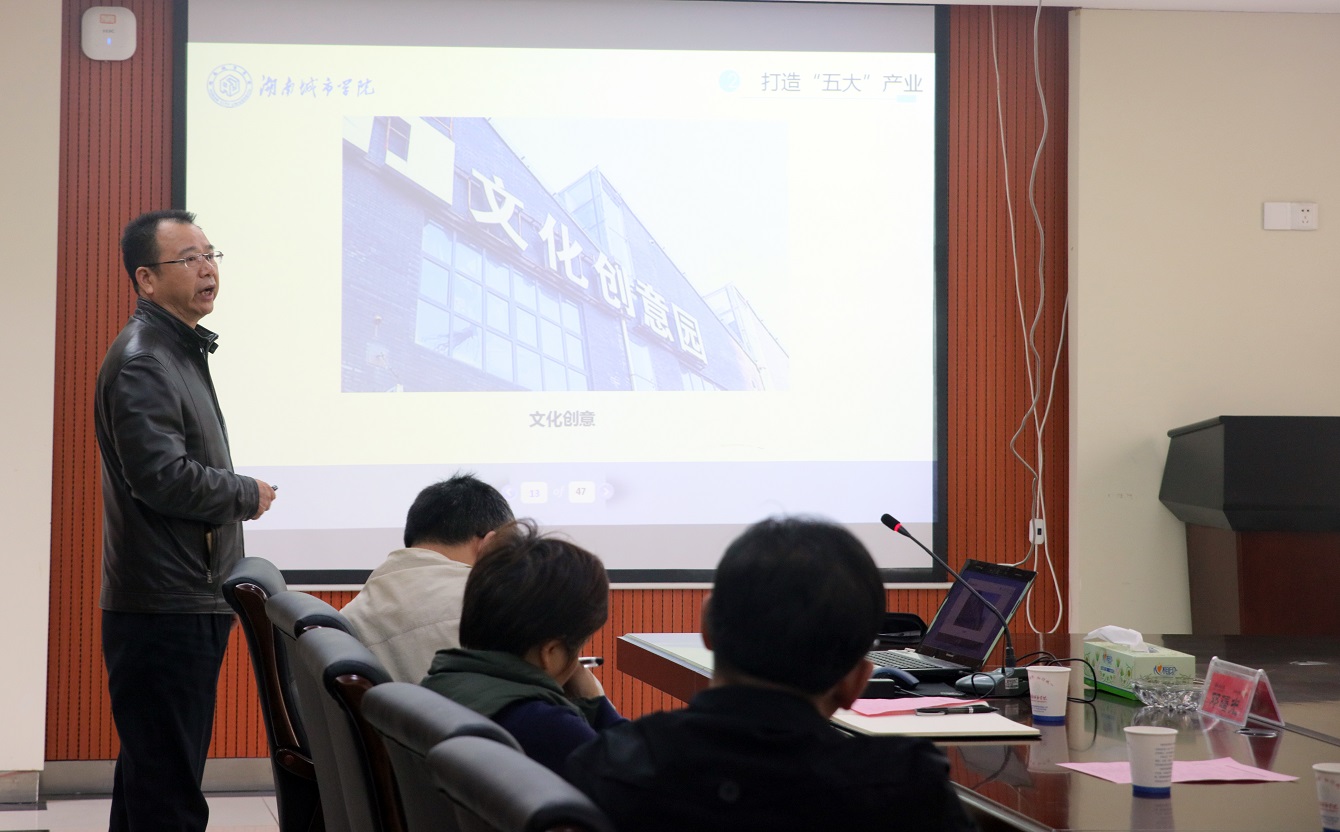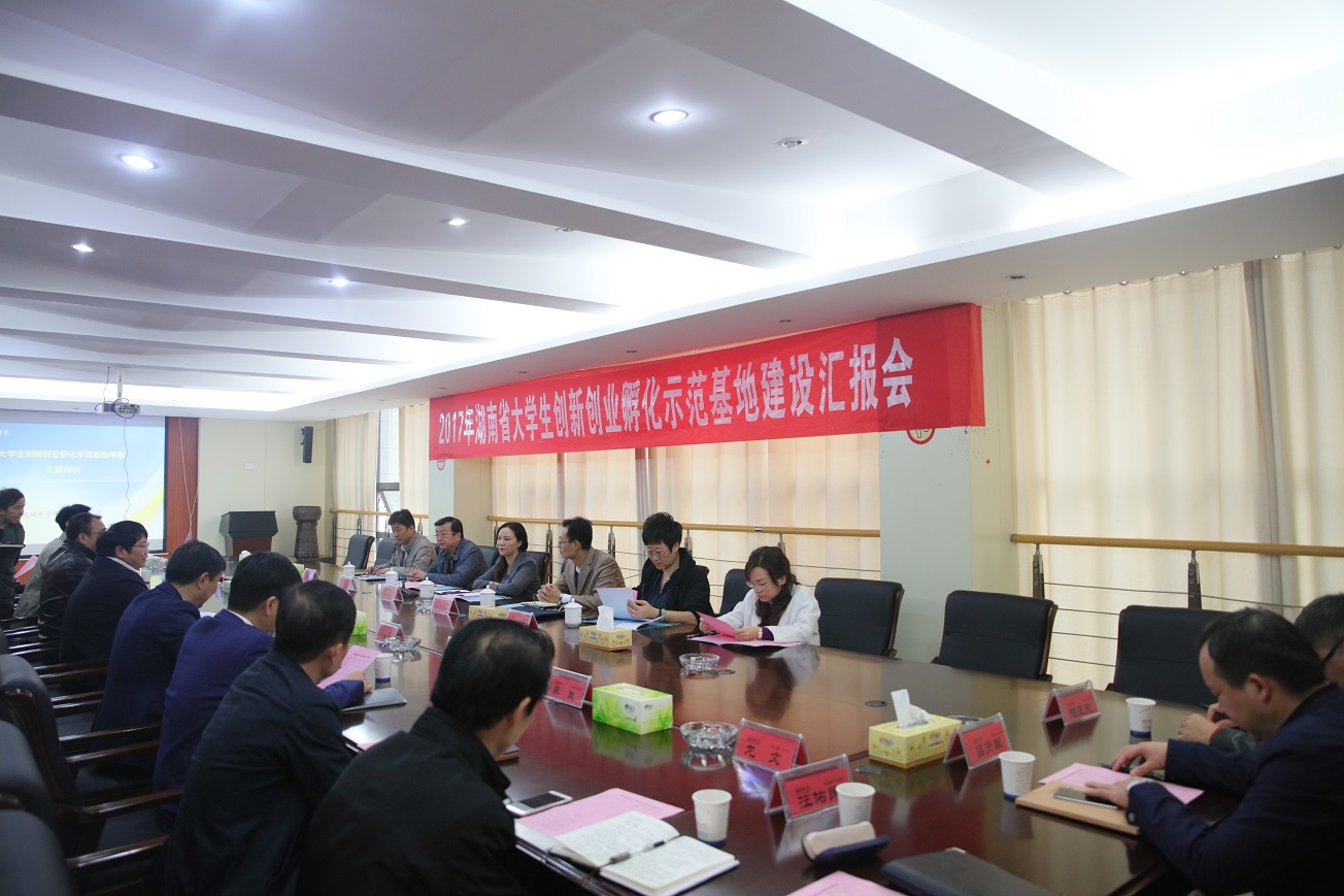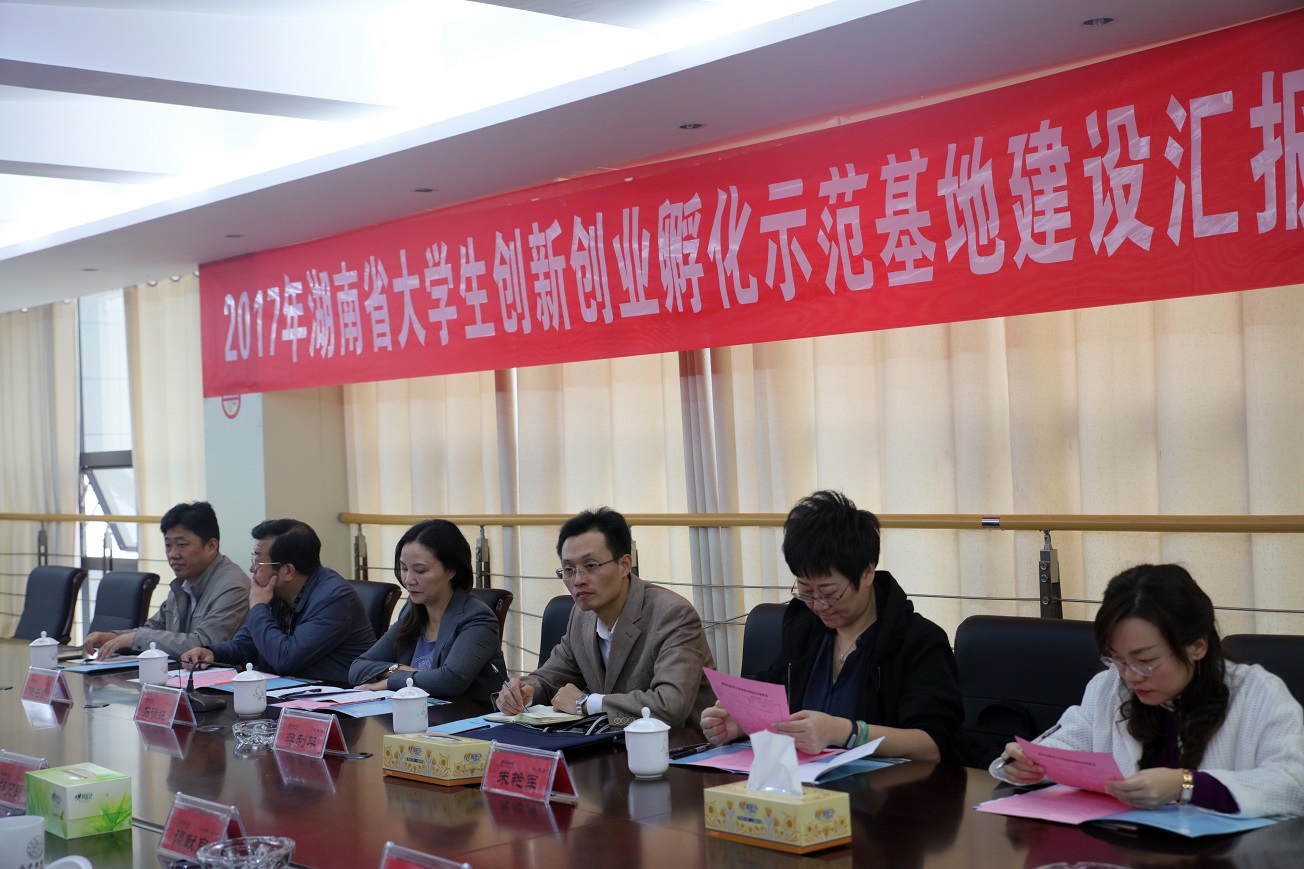 (本网讯)10月23日上午,受省教育厅委托,以湖南人文科技学院副院长石潇纯为组长的2017年湖南省高校大学生创新创业孵化示范基地评审组专家一行六人来校,对永利官网大学生创新创业孵化示范基地建设情况进行评审。校领导罗成翼、李建奇、郑卫民、何振、谭献良出席会议,党政办、宣传部、人事处、教务处、科技处、学生处、团委等部门负责人,以及建规院、信电院、艺术学院、设计院、应创学院院长参加了汇报会和意见反馈会议。