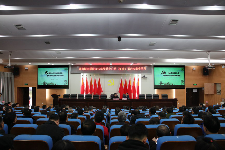 (本网讯)11月30日下午,学校2017年党委中心组(扩大)第六次学习在图书馆报告厅举行。党委书记罗成翼就全面深入学习贯彻党的十九大精神为师生代表作辅导报告。校领导李建奇、汤放华、夏宏宇、姚春梅、郑卫民、刘辉煌、何振、雷存喜、谭献良、范志超出席会议。全校处级以上党政干部、各二级学院党委(总支)书记、各基层党支部书记、全体辅导员及马克思主义学院全体教师等400余人参加会议。报告会由校长李建奇主持。