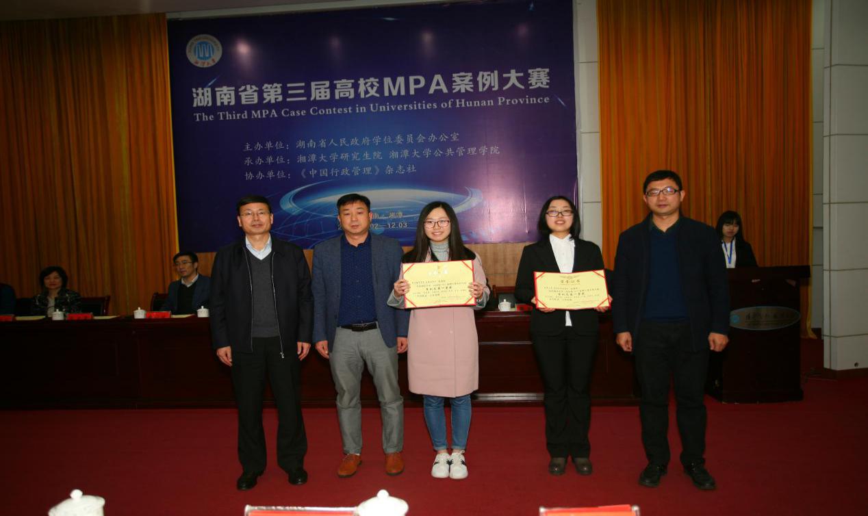 (本网讯)12月3日,由湖南省人民政府学位委员会办公室主办的湖南省第三届高校MPA 案例大赛颁奖大会在湘潭大学举行。由永利官网管理学院李双清博士指导,黄晶晶、黄茜、龙玲、伍栩娴等4位同学组成的代表队荣获此次大赛本科生组一等奖,李双清被评为大赛优秀指导教师。