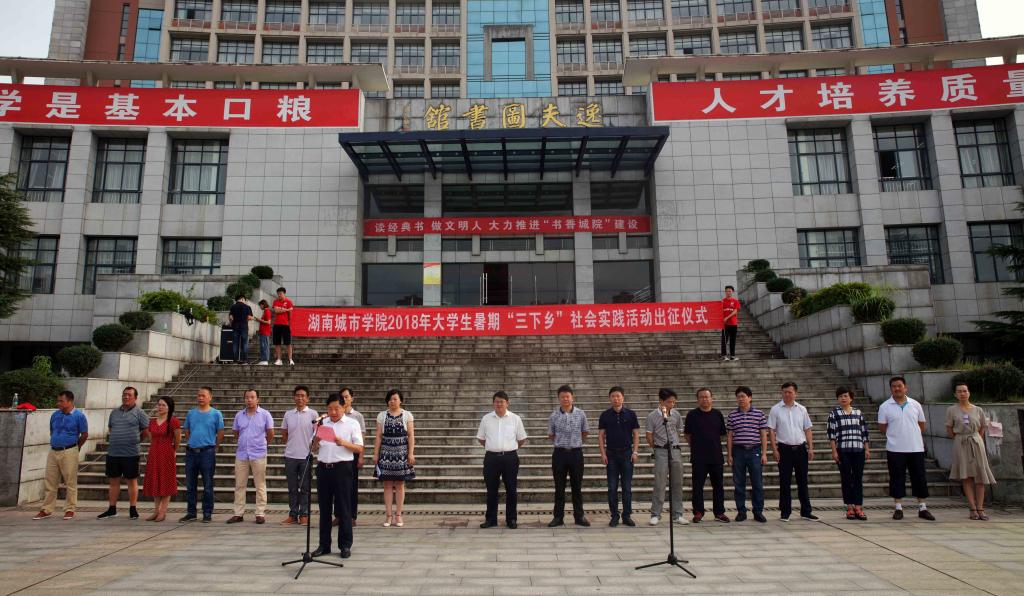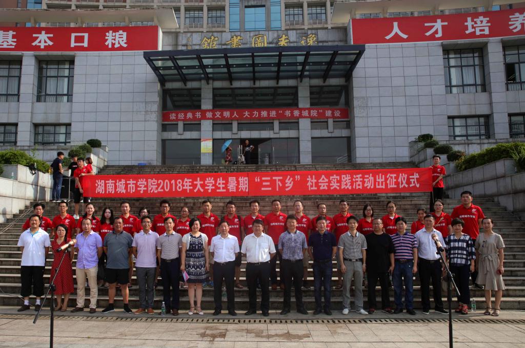 (本网讯)深入学习贯彻习近平新时代中国特色社会主义思想,引领教育广大城院青年学生勇做担当民族复兴大任的时代新人,切实在感受改革开放40年取得的新成就新面貌的生动实践中受教育、长才干、作贡献,7月5日上午8:00,永利官网2018年大学生志愿者暑期文化科技卫生“三下乡”社会实践活动出征仪式在兴城广场隆重举行。校党委书记罗成翼、党委副书记汤放华、副校长谭献良出席活动,学校德育工作小组成员、各学院团委书记、指导教师及学生志愿者代表参加活动。谭献良主持仪式。