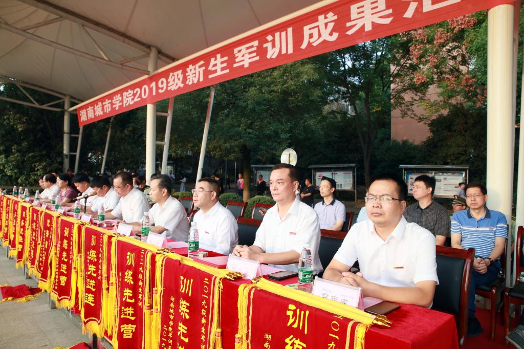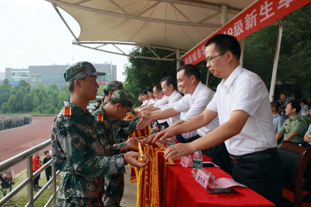 党委副书记汤放华宣读了《yl23455永利官网2019级新生军训表彰决定》:体育学院、机械与电气工程学院、建筑与城市规划学院、艺术学院获得训练先进营称号,机械与电气工程学院100连等11个连队获训练先进连称号,材料与化学工程学院等4个营获内务优胜营称号,市政与测绘工程学院7连等11个连队获内务优胜连称号,教师教育学院获优秀组织奖;毛欢欢等被8人被评为优秀辅导员及工作人员,夏凤瑞等28人被评为优秀教官,刘泉蔚等216人被评为军训标兵。与会校领导为受表彰的集体和个人颁发了锦旗。