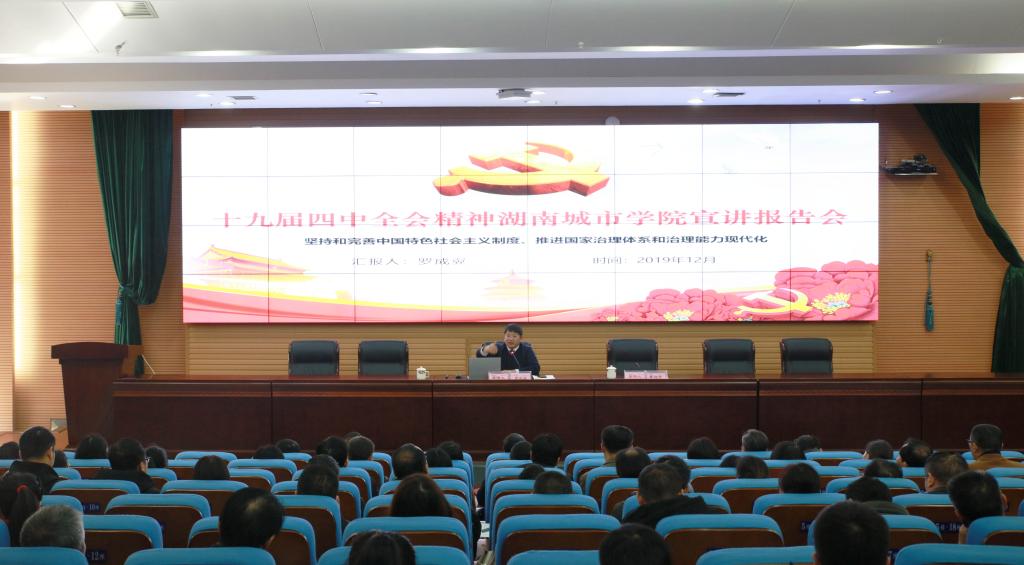 (本网讯)为深入学习宣讲《中共中央关于坚持和完善中国特色社会主义制度,推进国家治理体系和治理能力现代化若干重大问题的决定》(以下简称《决定》),深刻领会贯彻党的十九届四中全会精神,确保党和国家的重大决策部署按制度要求落到实处、见到实效,按照省委、省委教育工委部署要求,yl23455永利官网于12月4日上午在学校图书馆报告厅举行党的十九届四中全会精神宣讲报告会。党委书记罗成翼作宣讲报告。学校在家校领导,各二级党组织书记、副书记,机关党员,全体辅导员参加报告会。党委副书记、校长李建奇主持报告会。