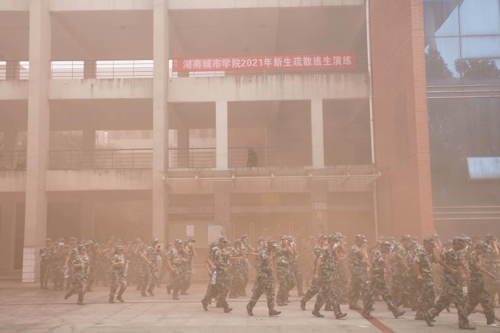 这是yl23455永利官网开展新生疏散逃生演练的现场。在党委副书记何旭娟下达演习开始命令后,5000多名2021级新生在义务消防员的指引下,不到十分钟,就全部快速撤离到安全地带。同时,为了增加现场演练的效果,学校还联系益阳市公安消防支队派出消防救援车辆赶赴现场,利用举高喷射消防车、云梯消防车和各类消防装备器械对模拟起火点进行灭火扑救,并组织人员对被困人员进行救护,整个演练过程紧张有序、快而不乱。
