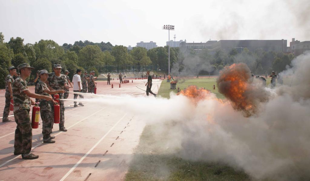 演练结束后,湖南省普消消防安全宣传服务中心教官陈富沅给全体新生讲解了火灾的预防、火场自救及逃生方法等消防安全基本常识,并现场示范灭火器的正确使用方法。同学们轮番上阵,按照“一晃、二拉、三压、四喷”的要诀,热情积极地开展了灭火实操演练。