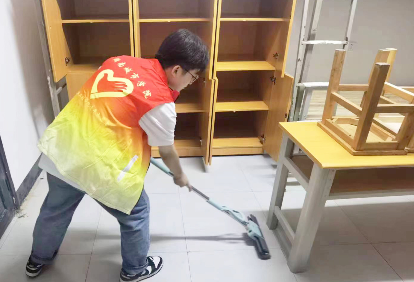 校长汤放华与师生志愿者一起打扫新生寝室卫生。