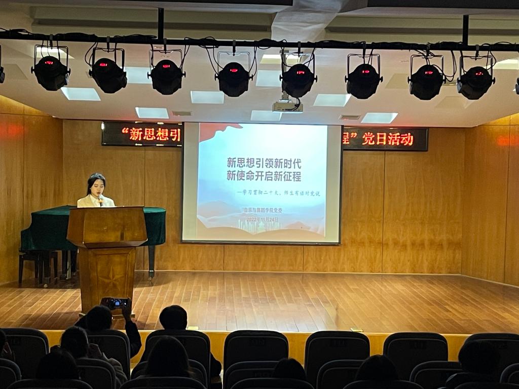 活动中,学院党委下属音乐学样板支部,精心设计和策划了系列活动,包括两场微党课、一个微视频、一段微朗诵、一场微竞赛。音乐与舞蹈学院党委书记谢立新以“用心用力为党为国育才”为题,号召全院师生党员面对新征程和新目标,提出新要求,开展新奋斗,在凸显中国特色、提升师德师风、加快教育数字化等方面下功夫。音乐学系党支部书记周晋以“办好人民满意的教育”为题,介绍了党的二十大报告中关于新时代新征程办好人民满意教育的总体思路和重点任务。