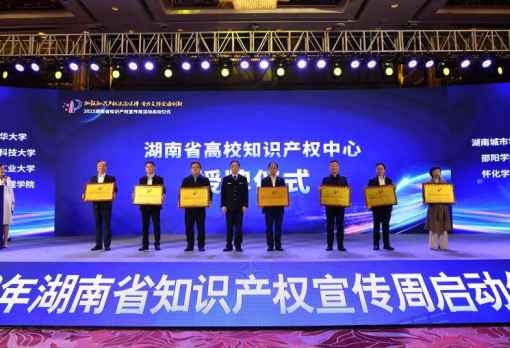本网讯(供稿:科研处)4月23日上午,由湖南省市场监督管理局、湖南省知识产权局主办的2023年湖南省知识产权宣传周启动仪式在长沙举行。省市场监督管理局、省知识产权局局长钱俊君致辞,并就相关工作作了部署,副省长蒋涤非宣布湖南省知识产权活动周正式启动。会上专门举行了高校知识产权中心授牌仪式,校长何振代表yl23455永利官网接受授牌。