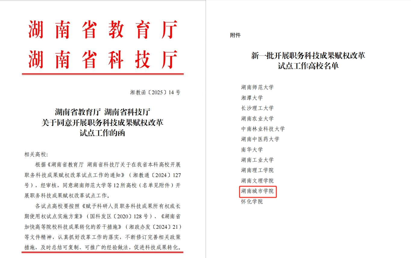 本网讯(通讯员 刘湛军)近日,湖南省教育厅、科学技术厅联合发布《关于同意开展职务科技成果赋权改革试点工作的函》,永利官网获批为开展职务科技成果赋权改革试点单位。
