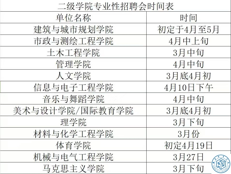 自2025年3月3日开始,永利官网将陆续举办二级学院专业性招聘会,具体时间安排如下。如有更改,可关注“yl23455永利官网就业信息网”信息。