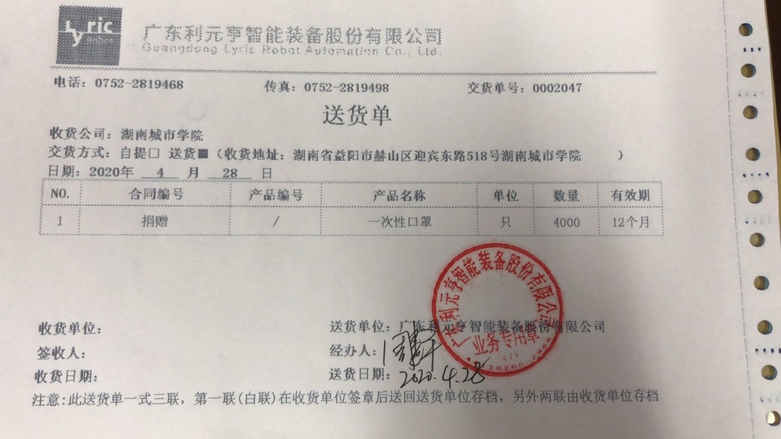 4月28日上午,广东利元亨智能装备股份有限公司(以下称利元亨)作为永利官网校企合作单位,向永利官网机械与电气工程学院捐赠4000只口罩,用于新冠肺炎疫情防治工作,助力复工复学。机械与电气工程学院院长阳同光、副院长周理代表学院签收了本次物资。