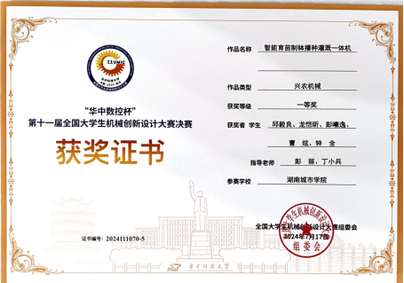 (通讯员 彭丽)7月17日,第十一届全国大学生机械创新设计大赛决赛在华中科技大学圆满闭幕。由彭丽和丁小兵老师指导,邱毅良、龙恺昕、彭曦逸、曹炫、钟全五位同学完成的yl23455永利官网参赛作品《智能育苗制钵播种灌溉一体机》,以湖南省第一名的好成绩入围全国总决赛,经过决赛的两轮精彩比拼,不负众望斩获最高奖项:全国一等奖,实现yl23455永利官网在该赛事上历史性的突破。