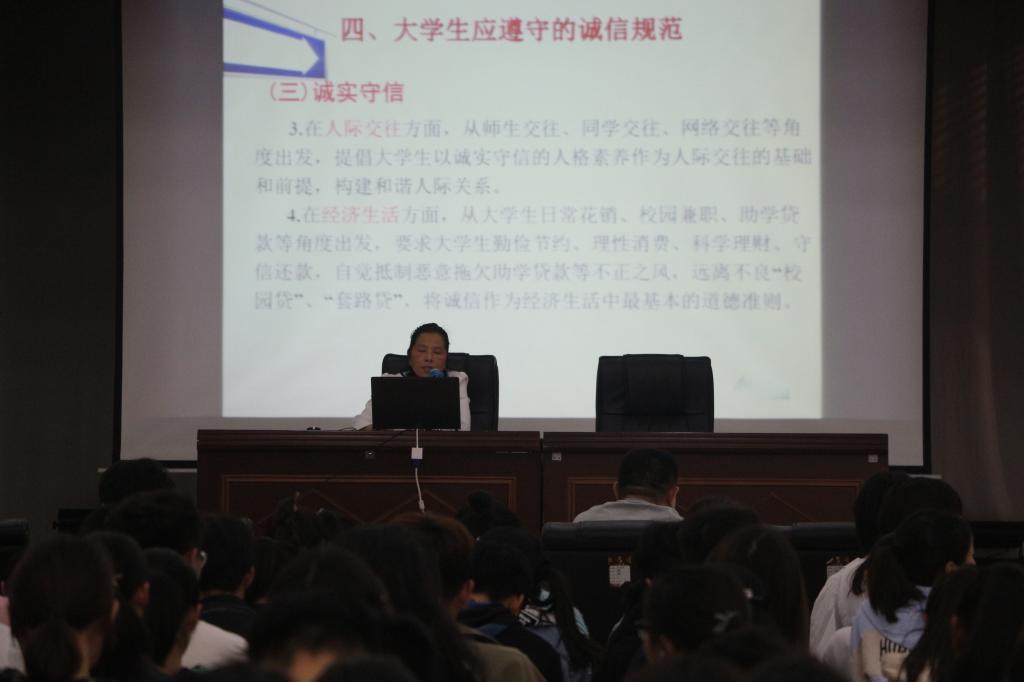 首先,管理学院副处级辅导员曹资立老师宣讲了“国家奖助贷”政策并对学生们进行了诚信教育。曹资立老师讲解了国家奖学金、国家励志奖学金、国家助学金、生源地信用助学贷款及生源地信用助学贷款相关内容。她又从诚信的内涵、诚信的重要性、大学生不诚信的突出表现、大学生应遵守的诚信规则四个方面向同学们强调了诚实守信对于大学生长期发展的重要性。随后,国家奖学金获得者毛子林、付佳同学分享其优秀事迹,她们激励广大大一新生努力学习,强调学习为学生之本。她们的事迹,起到了模范带头作用。最后,管理学院党委副书记蔡英杰宣讲了大学生征兵入伍政策,他阐明当代学生仍要牢记使命,保持艰苦奋斗的优良作风,争取入伍报效祖国。
