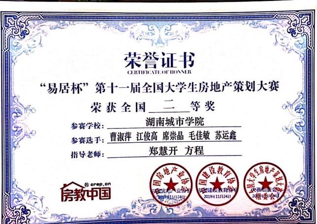 2019年11月22-24日,由中国房地产业协会指导、中国建设教育协会主办,北京建筑大学、房教中国、深圳大学联合承办的“易居杯”第十一届全国大学生房地产策划大赛全国总决赛在深圳大学隆重举行,永利官网派出两支队伍参加,均获全国二等奖佳绩,并获大赛“优秀组织高校”荣誉。