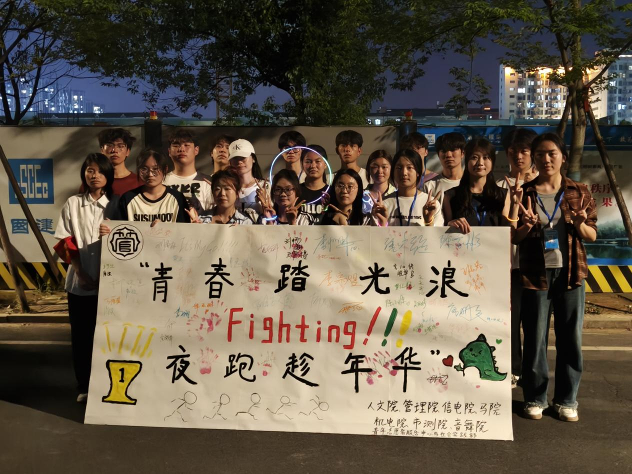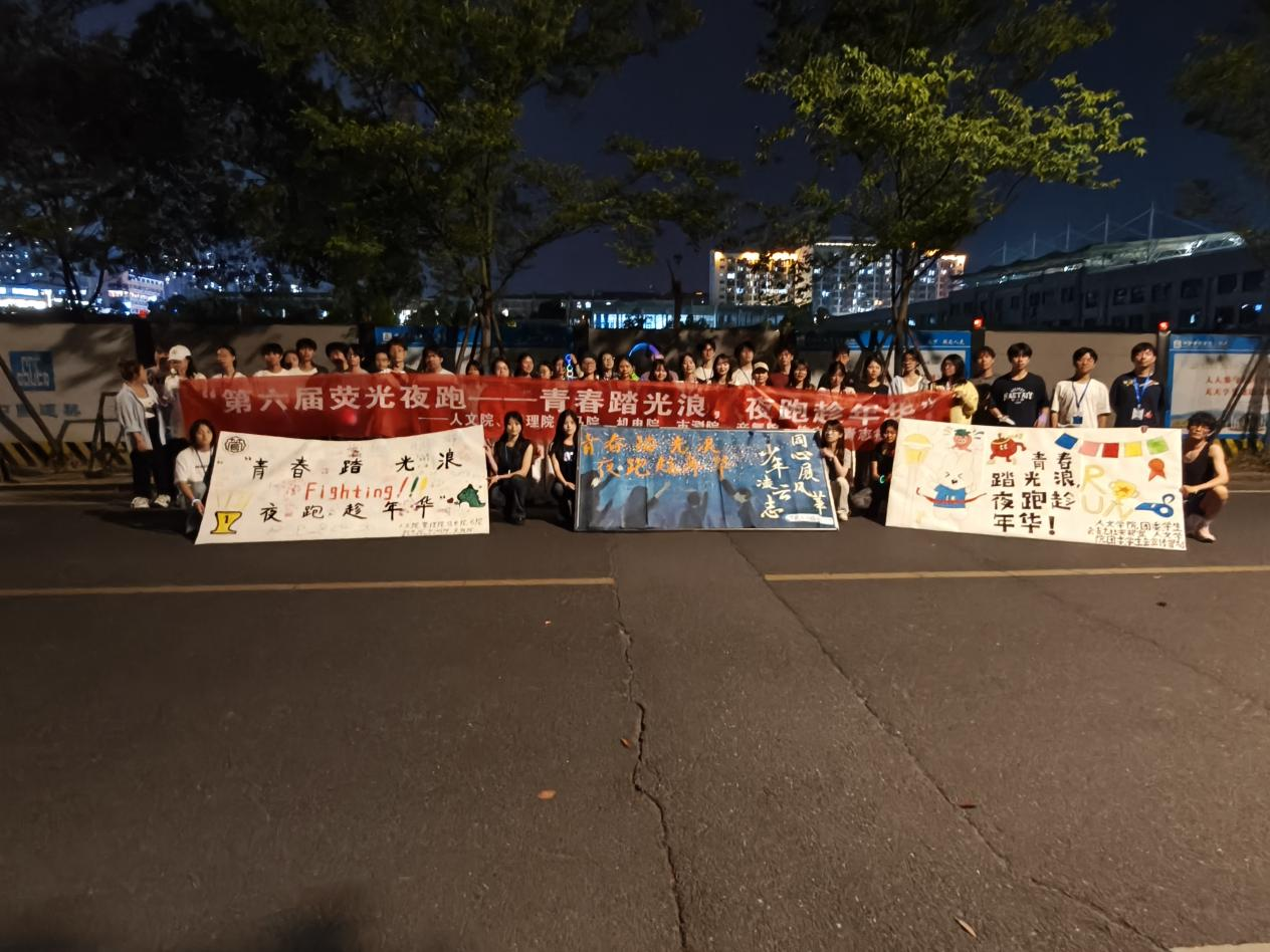 本网讯(通讯员 李钰 黄景熊)荧光散作燎原火,奔影燃成破晓光。为践行全民健身理念,培养德智体美劳全面发展的新时代青年,我院与其他院于2025年4月18日19时30分在学校内协办“青春踏光浪,夜跑趁年华”荧光夜跑活动。