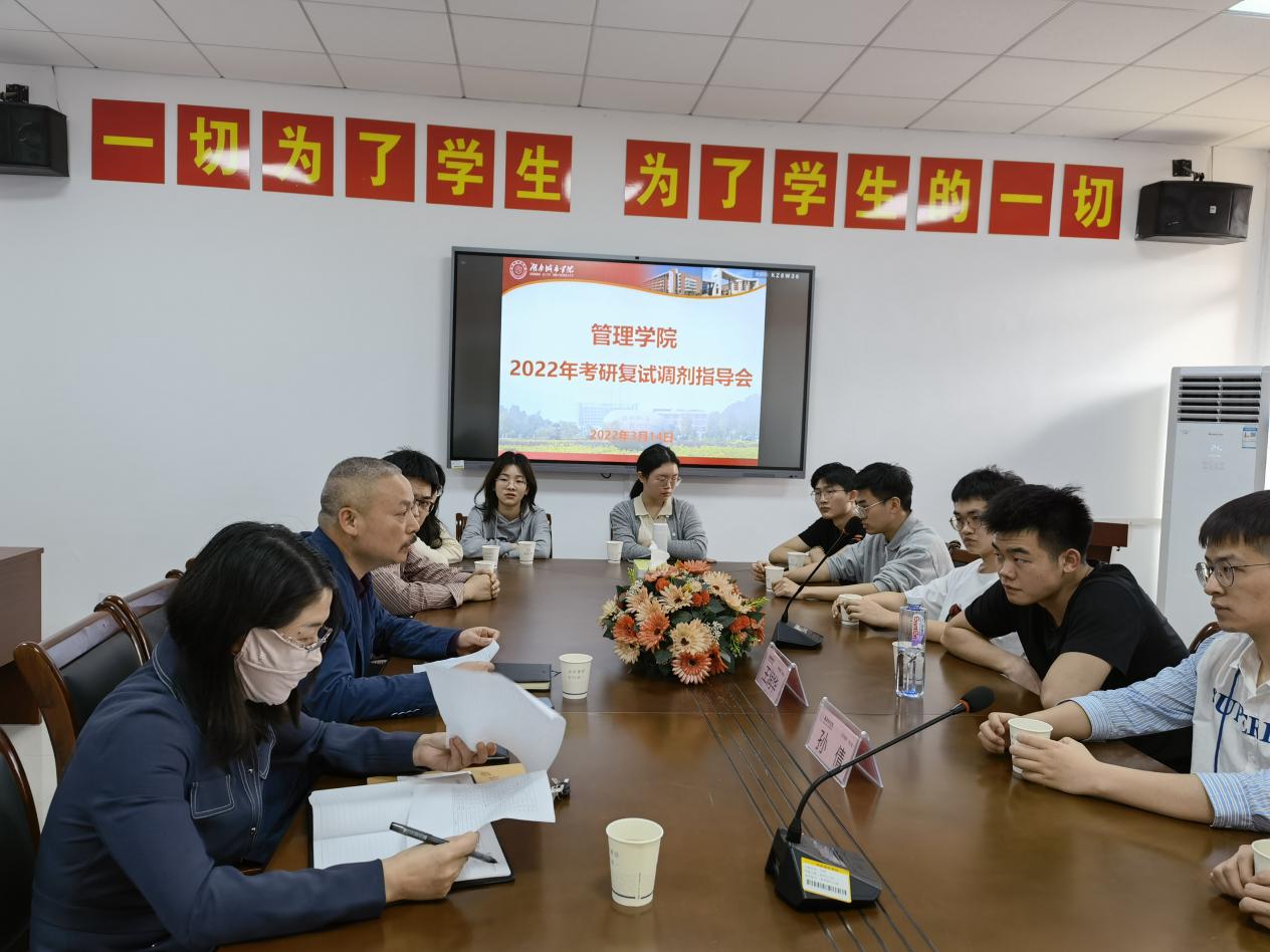 2022年3月14日,管理学院在管理楼622会议室举行了2022年考研复试调剂指导会,出席会议的有管理学院院长孙倩、管理学院党委副书记王润华,辅导员陈再师老师以及上线的考研学子参加此次会议。