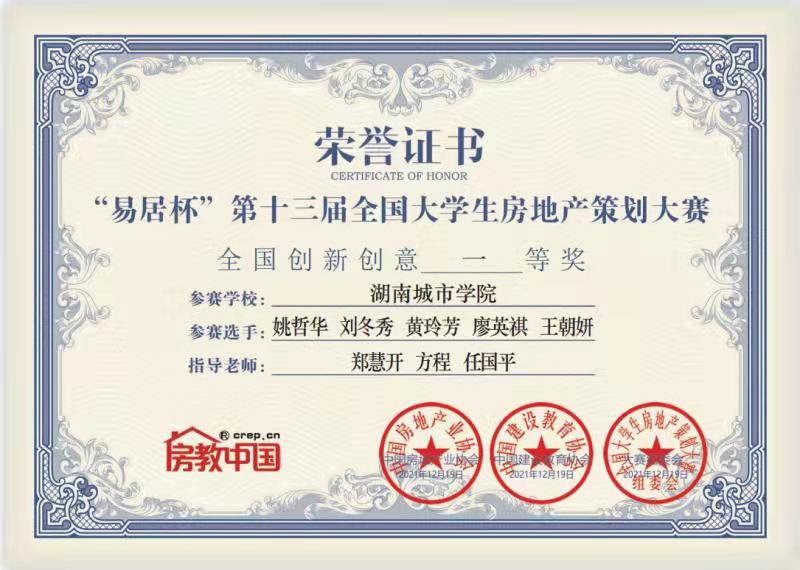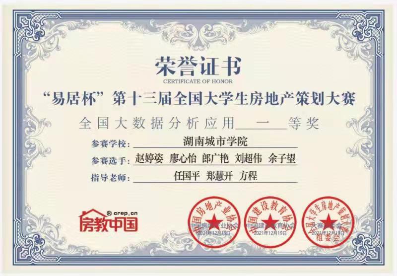 永利官网共派出六支队伍参赛,在管理学院郑慧开老师、任国平老师、建筑与城市规划学院方程老师认真严谨的指导下,参赛同学刻苦努力备赛。其中由19级房地产开发与管理专业姚哲华、廖英祺、黄玲芳、刘冬秀、赵婷姿、廖心怡、郎广艳、刘超伟、18级城乡规划专业王朝妍、余子望共十位同学组成的两支队伍均获全国一等奖。其余四支队伍分别获全国二、三等奖,永利官网并获大赛“优秀组织高校”荣誉,创历史新高!