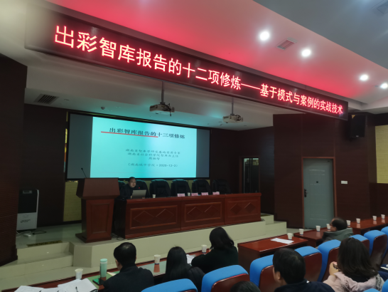 2020年12月2日下午,湖南省社科院智库办主任、湖南省智库学研究基地首席专家周湘智研究员应邀来校做题为《出彩智库报告的十三项修炼》的专题讲座。副校长何振主持报告会,全校师生代表在建规楼报告厅聆听了报告。
