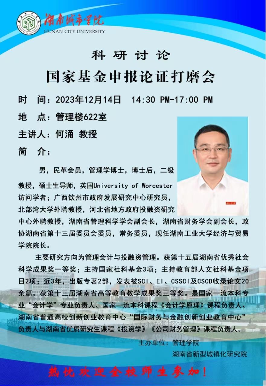2023年12月14日,管理学院在管理楼622室召开2024年国家基金标书论证打磨会。本次会议邀请湖南工业大学经济与贸易学院院长何涌教授作为论证专家,管理学院博士及副教授职称以上的教师参加了会议。