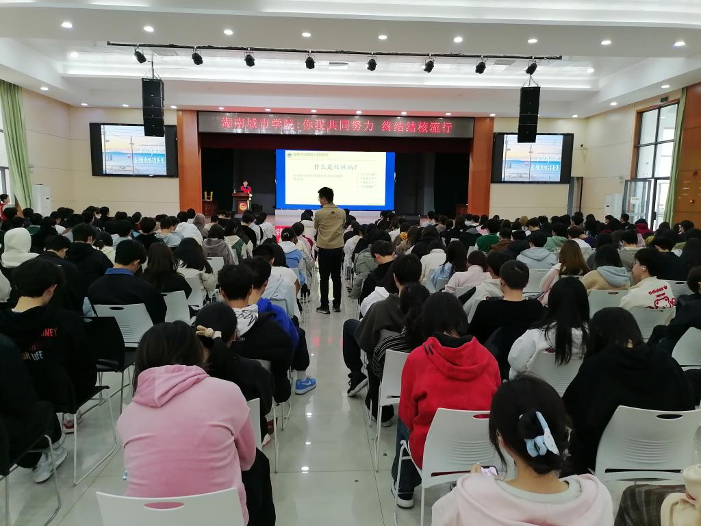 3月21日下午,益阳市疾病预防控制中心、赫山区疾病预防控制中心、益阳市第四人民医院在永利官网学生活动中心联合开展健康宣教讲座,300多名师生聆听。讲座内容包括结核病、肝炎和艾滋病的防治以及院前急救等四个方面。益阳市疾病预防控制中心结核病防治科负责人表示,终结结核流行,需要你我共同努力,需要全校师生员工的共同参与。并就永利官网做好今年结核病防治工作提出三点指导性建议,一要加强结核病防治知识的宣传教育;二要持续做好结核病的筛查和监测工作;三要加强部门合作和社会参与。同时,鼓励大学生志愿者不懈努力,号召更多的师生参与到结核病防治事业中来,营造全校共同防治结核病的良好氛围。
