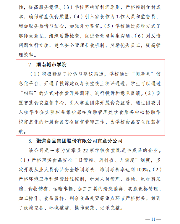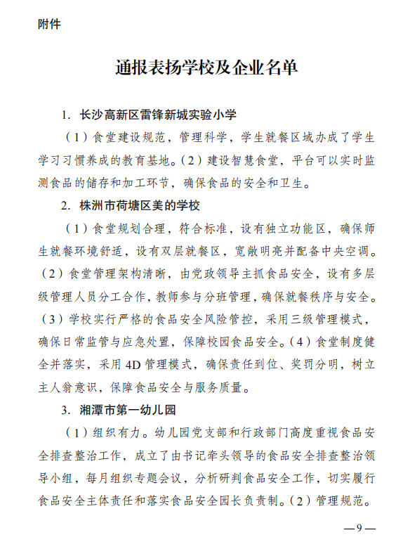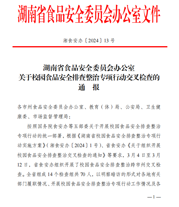 (撰稿 聂奕勋)2024年4月16日永利官网收到湖南省食品安全委员会文件《关于校园食品安全排查整治专项行动交叉检查的通报》,通报中对永利官网“积极畅通投诉与建议渠道”、“引入学生团体齐抓共管食品安全”等举措提出了表扬。