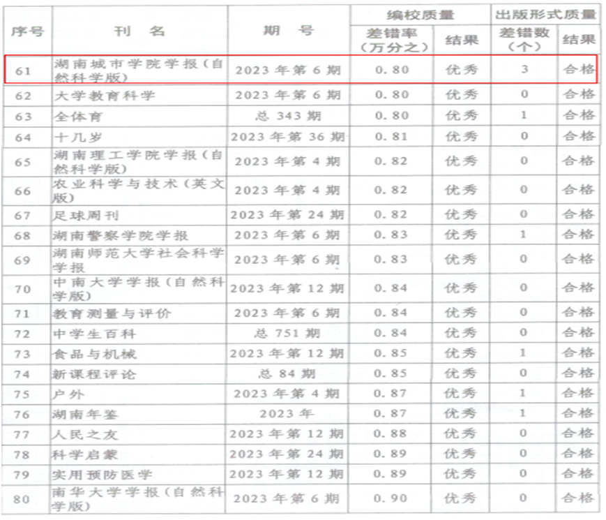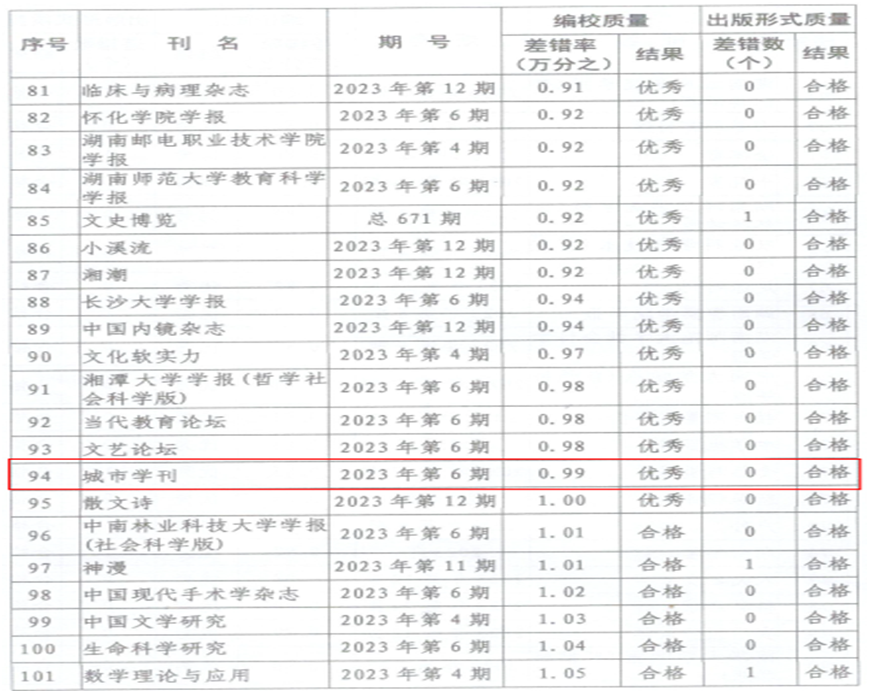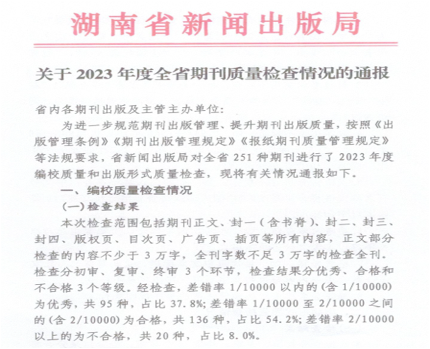 期刊质量检查现已纳入全省意识形态巡视考核内容,是期刊社会效益评价考核和期刊年度核验的重要内容,主要检查各刊编校质量和出版形式质量,检查结果分为优秀、合格和不合格3个等级。本次检查了全省251种期刊,其中,差错率在1/10000以内(含1/10000)的期刊为优秀,《yl23455永利官网学报(自然科学版)》和《城市学刊》在全省高校学报中表现优异。