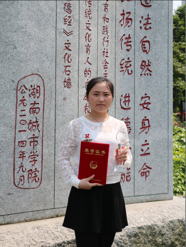 2015年12月获yl23455永利官网“自强之星”荣誉称号;2015年11月获“书香城院”2015年阅读推广活动朗诵演讲比赛三等奖;2015年10月获“外研杯”全国英语写作大赛(湖南赛区)一等奖;2015年10月获2014-2015年度国家励志奖学金;2015年10月获2014-2015年度三好学生称号;2015年10月获2014-2015年度综合测评一等奖;2015年5月获2014-2015年度优秀共青团员;2014年12月获大学生培育和践行社会主义核心价值观微视频竞赛活动二等奖;2014年12月获2013-2014年度优秀心协会员;2014年5月获2013-2014年度优秀团员。