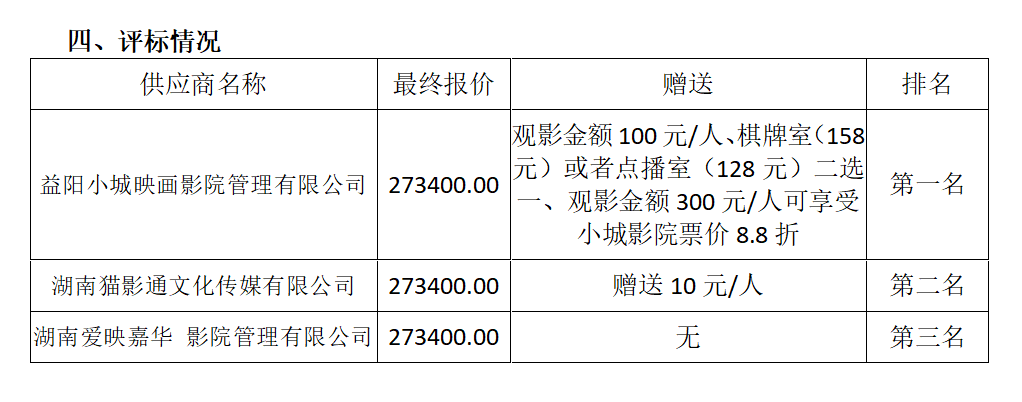 成交供应商名称:益阳小城映画影院管理有限公司